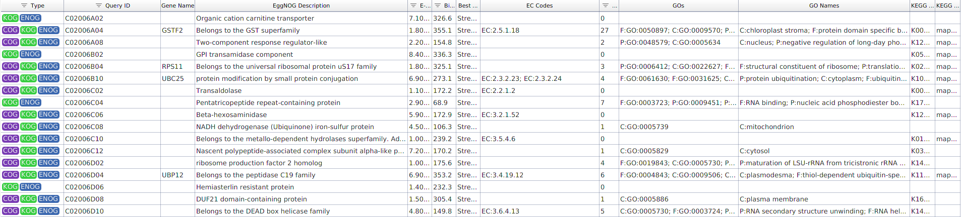 The result table summarizes all annotations that could be transferred with EggNOG Mapper. Besides ordering and filtering, the context menu allows taking a closer look at certain results (figure 2). This annotation process also generates a Summary Report with information about the total number of GOs, the COG categories and the orthologous groups distribution.
