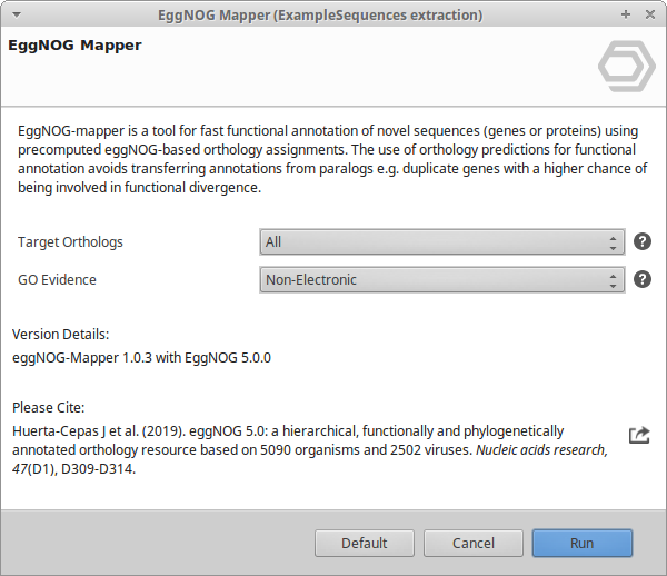 EggNOG-mapper can be found under Functional Analysis → EggNOG Annotation → EggNOG Mapper. The wizard allows to select the parameters for the functional annotation (figure 1).