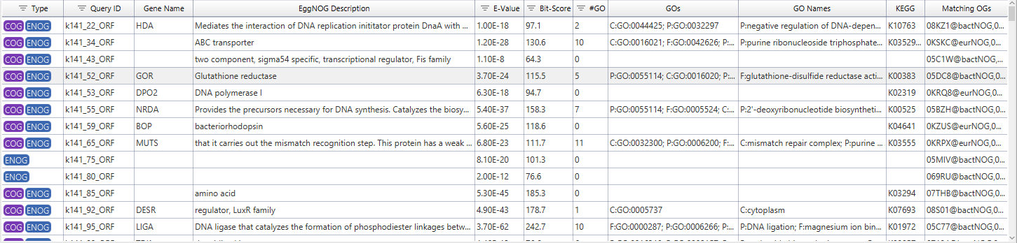The result table (figure 3) summarizes all annotations that could be transferred with EggNOG Mapper. Besides ordering and filtering, the context menu allows to take a closer look at certain results.