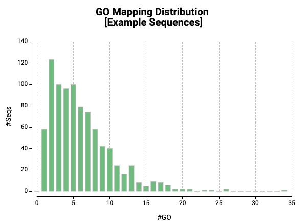 - GO Mapping Distribution: This shows the distribution of the number of Gene Ontology candidate terms assigned to each sequence during the GO Mapping step.