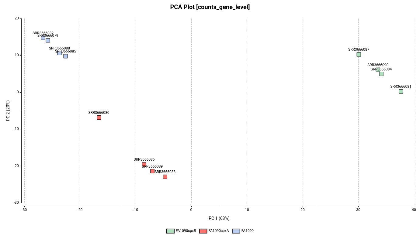 This feature performs a Principal Component Analysis and generates a 2D (Figure 12) or 3D (Figure 13) with the two and three first Principal Components, respectively. This chart helps to identify which samples are similar to each other in terms of gene expression. Ideally, samples belonging to the same condition should appear closer in the plot.
