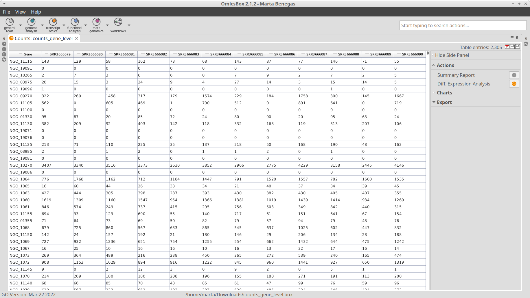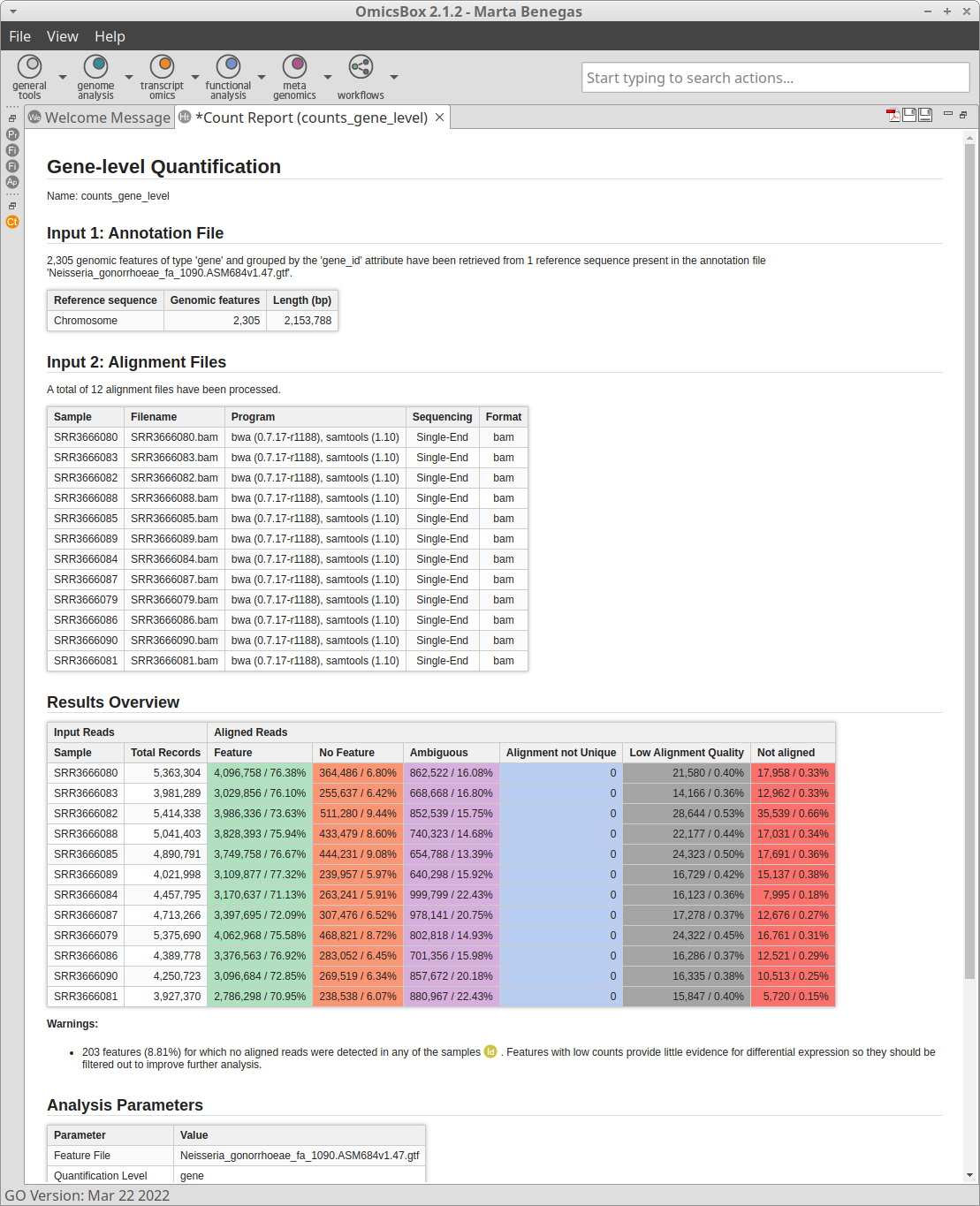 Furthermore, a result page will show a summary of the "Create Count Table" results (Figure 7). On this page information about the extraction of genomic features from GFF, alignment files, and obtained results are provided. The result summary can be generated via Side Panel → Actions → Summary Reportand it can be exported as pdf.