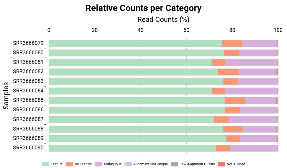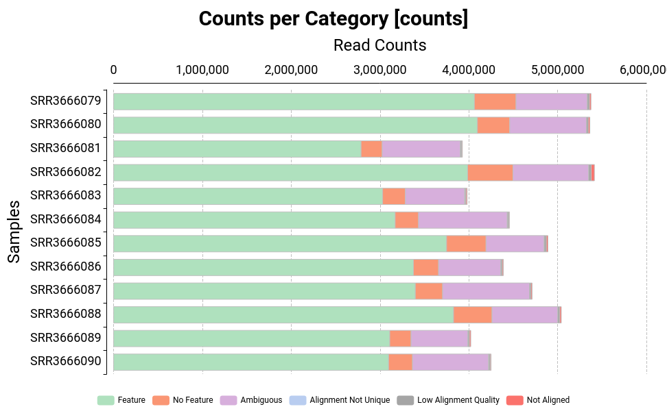 - Ambiguous: Reads which have been assigned to more than one feature (the resulting set for the read has more than one feature). These reads are not counted for any feature.