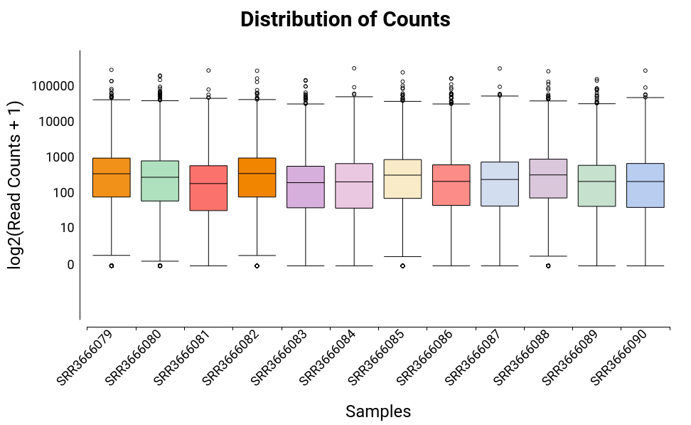 Box plot that allows seeing how counts are distributed within each sample for all the features (Figure 9). Features with 0 counts in all samples will be discarded for this chart. The binary logarithm of raw counts is represented.