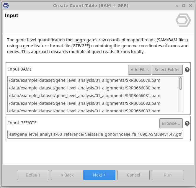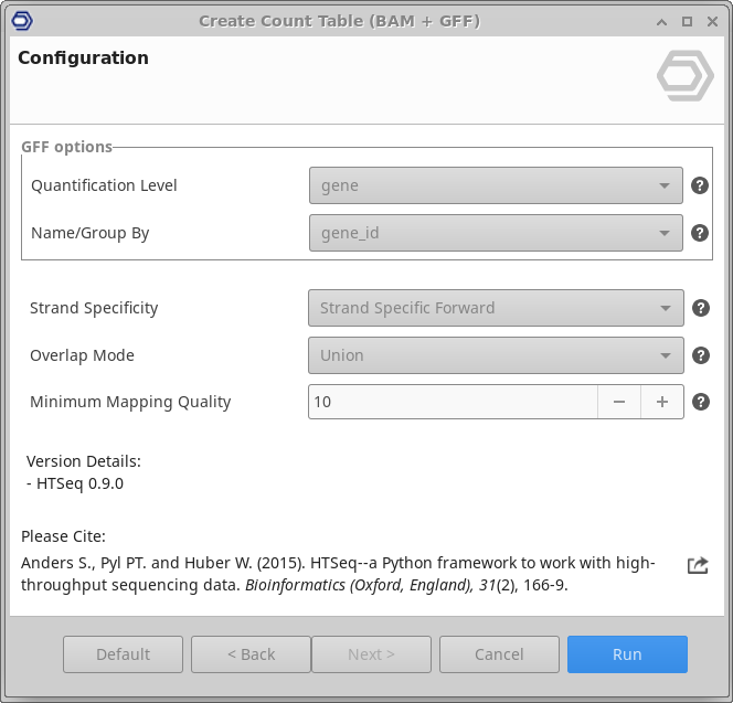 This functionality can be found under transcriptomics → RNA-Seq Read Quantification → Gene Level Quantification. The wizard allows to select input files and adjust analysis parameters (Figure 2 and Figure 3).