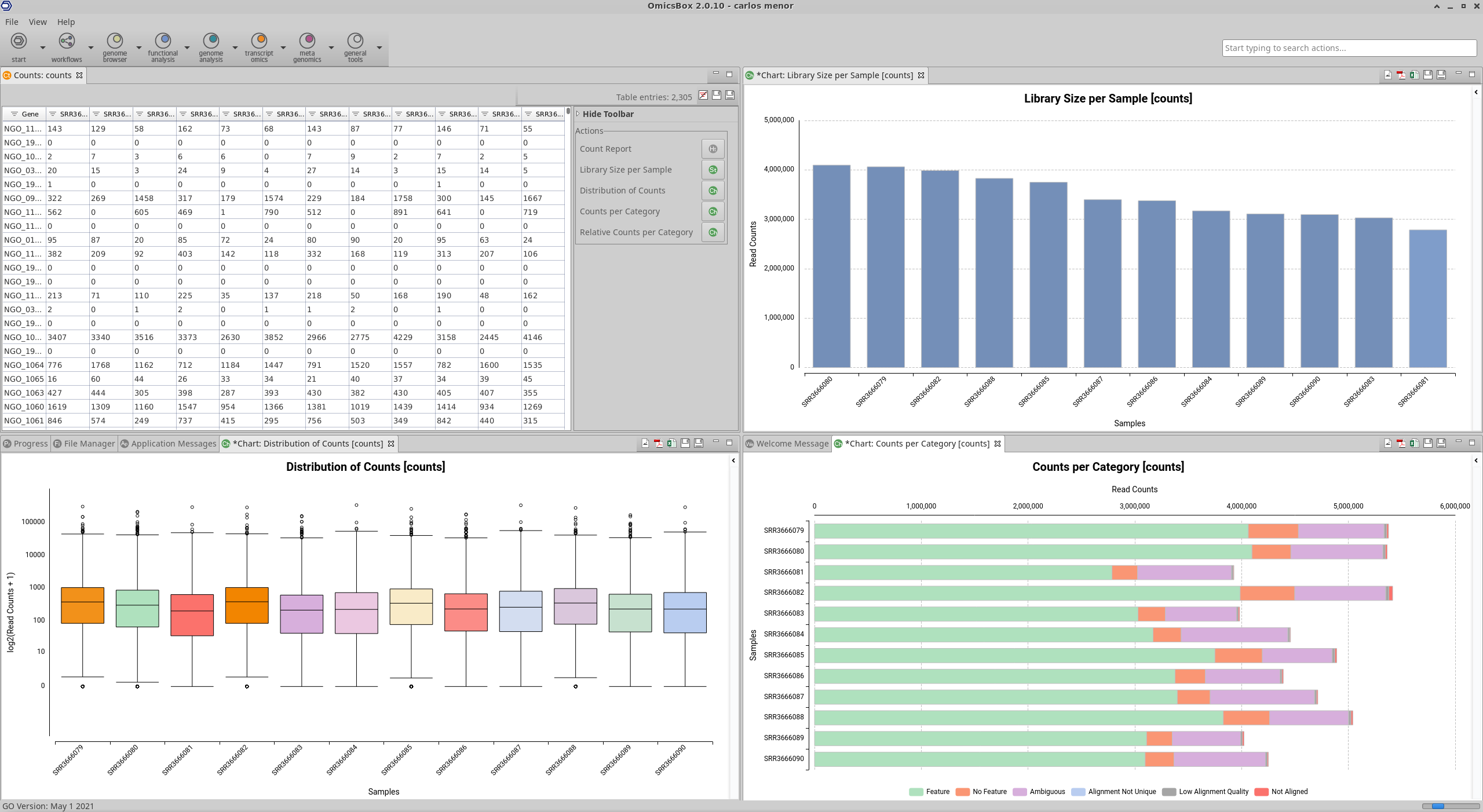 Different statistical charts of the obtained results can be generated. These provide additional information about the process of quantifying expression, as well as a quality assessment of the resulting counts. All these charts can be found under the Side Panel → Charts of the Count Table viewer.