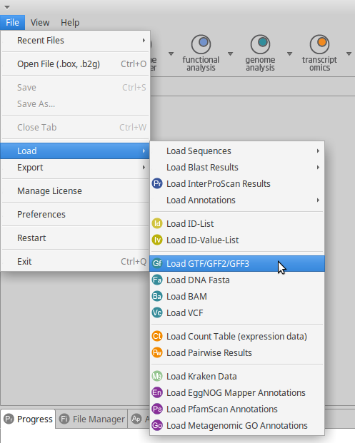 Files must be loaded in order to be shown on the Genome Browser to do that just click on the File menu and under the Load sub-menu you can load GFF, VCF, DNA Fasta and BAM files. These files can be loaded in either with .gff or .gz extension.
