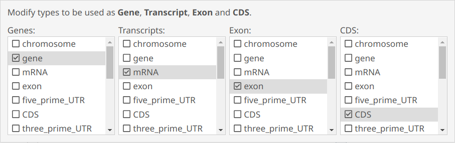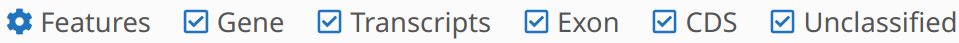 With the Features button controls you can classify the types for Genes, Transcripts, Exons and CDS, this will modify the Gene group visualization, by default these types will be set automatically. The checkboxes will hide or show the features, i.e. if you want to show only the genes, you need to uncheck the Transcripts, Exon, CDS, and Unclassified checkboxes.