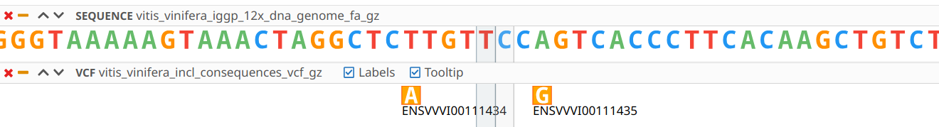 The VCF track shows the variants in the corresponding position and if you zoom in enough, the alternative nucleotide will be shown.