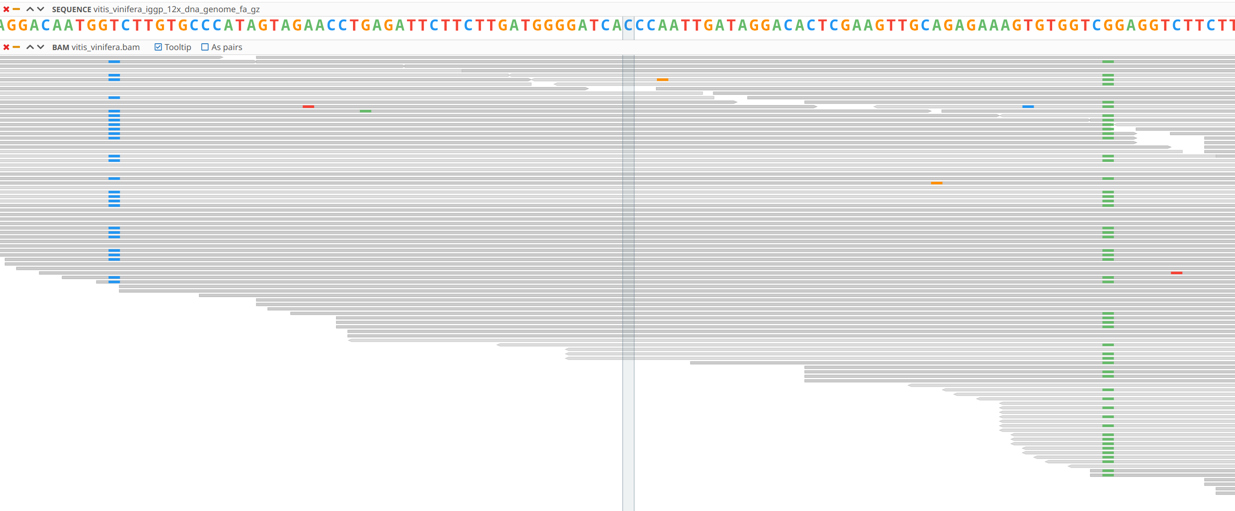 The BAM track shows the reads of a BAM file and if the sequence track is active, will also paint the differences between the read sequence and the sequence track. If you click on the