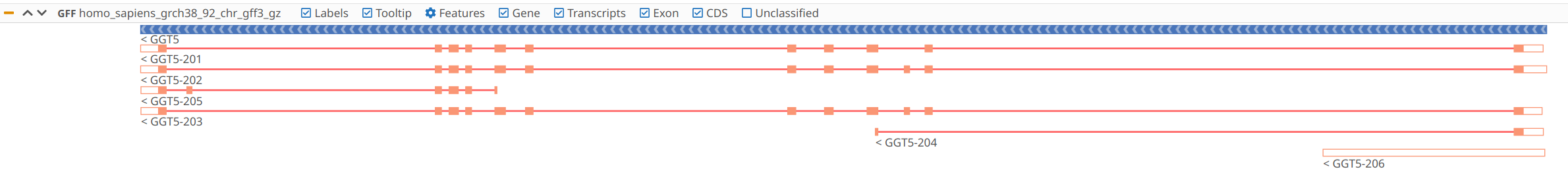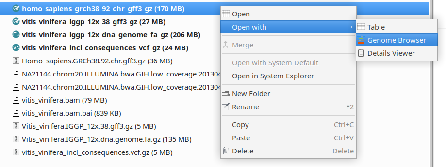 The GFF track is able to detect types to group features by genes (genes, transcripts, exons and CDS and the relationship between them by using ID and Parent attributes, see GFF3 Specification for more details ). Genes are in blue, the transcripts are the small red lines, non-coding exons are white boxes with orange border and exons with CDS are filled with orange color. Other non-grouped features appear in grey. GFF Viewer can be opened with the context menu option in the File Manager when selecting a GFF file and using the context menu option Show in GFF Viewer from the tablewhen exploring a GFF file.