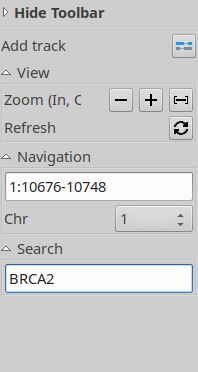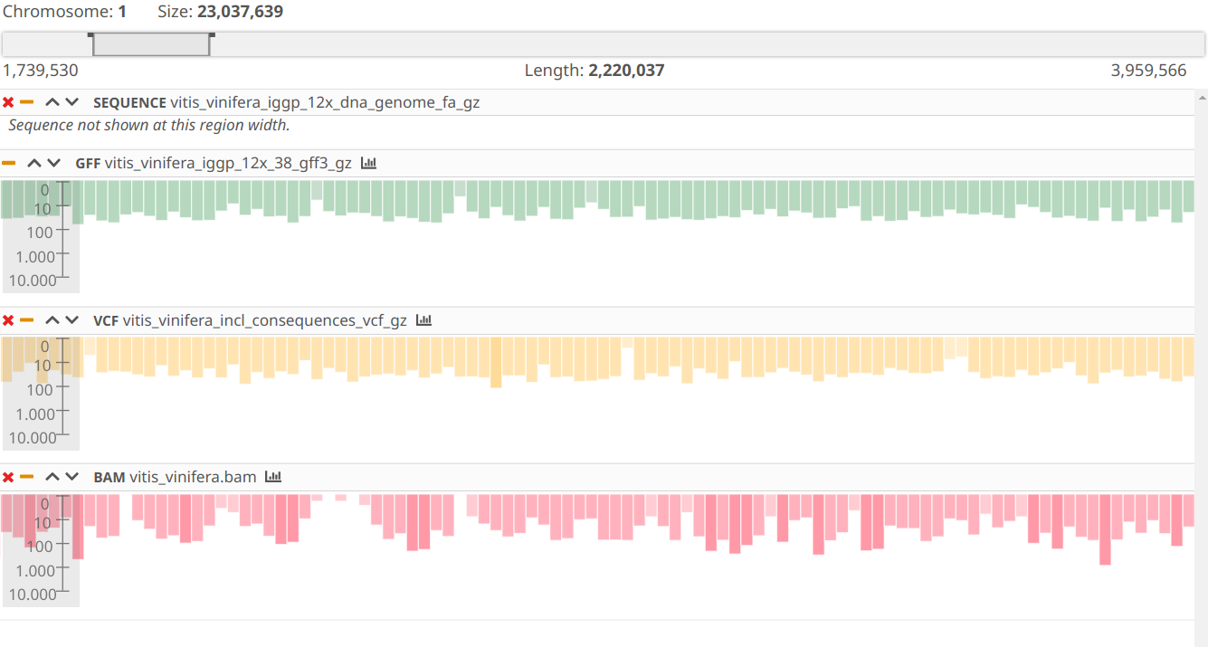 Navigation is executed using the mouse. To initiate scrolling, left-click and hold the button, then move the mouse horizontally to navigate left or right. Additionally, it is possible to focus on a specific feature or gene by double-clicking on it. Zooming in and out within the current region can be achieved through the "Zoom buttons" located on the Toolbar. Should you zoom out sufficiently, the display will transition to show a histogram for broader visualization purposes. The chromosome box allows for selection of new regions either by clicking directly or selecting a new box area through click-and-drag actions.