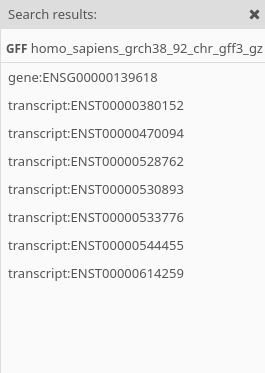 It is also possible to find features on the GFF and the VCF track using the Search field in the Toolbar, the search results will be shown on a panel beside the Toolbar.