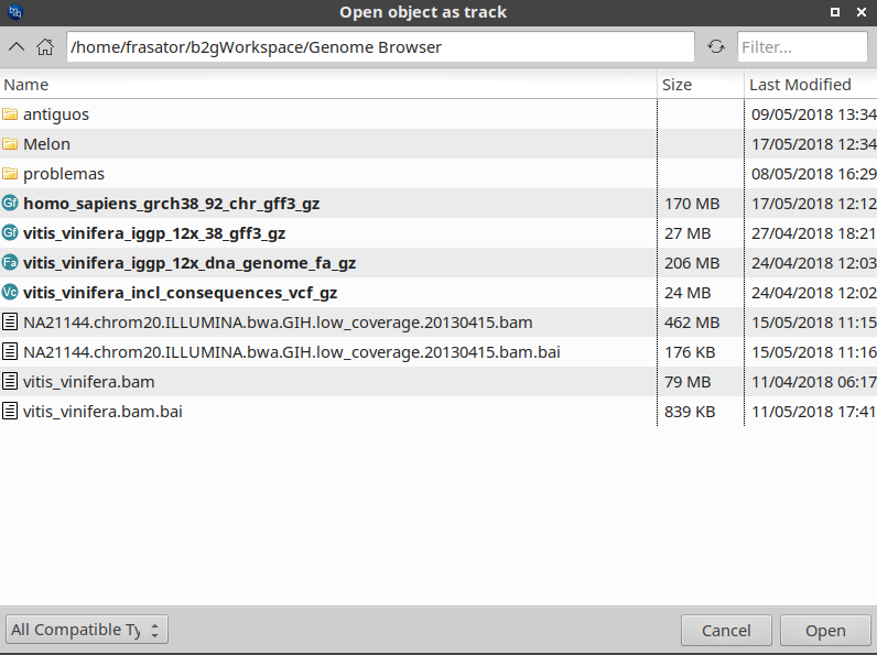 Also, you can add more tracks to the current Genome Browser using the Add track button. A window will appear the available files that can be opened with a Genome Browser as tracks.