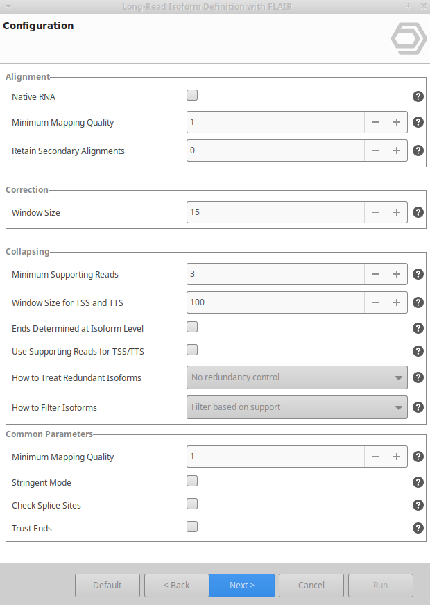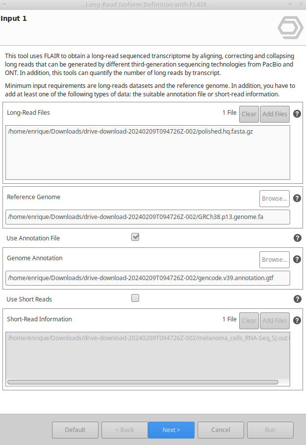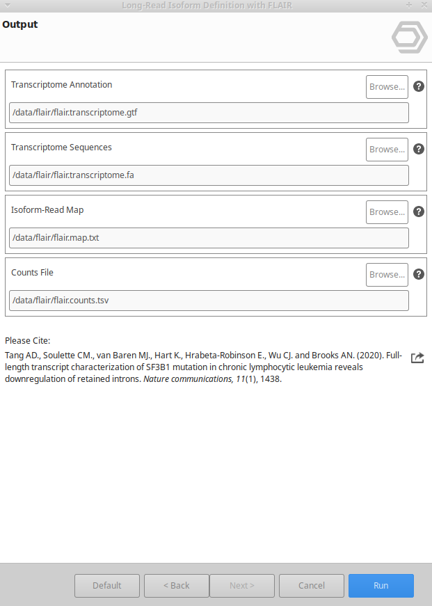 FLAIR can be found under Transcriptomics → Long-Reads Analysis → Transcript Identification → Identification and Quantification with Flair.The wizard consists of 4 pages and allows to define the input and output options as well as the analysis parameters (Figure 2, Figure 3, Figure 4 and Figure 5).