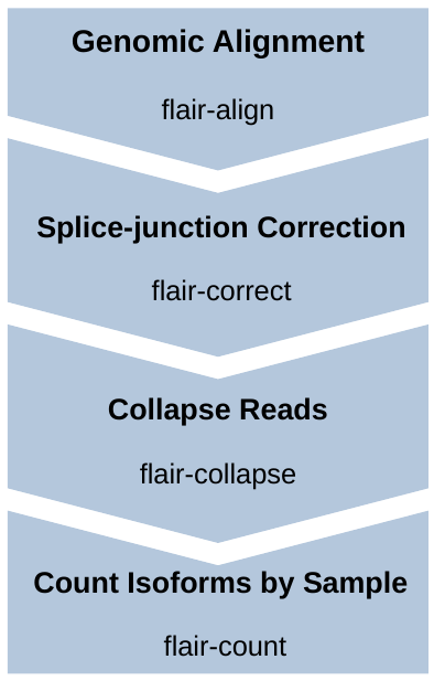 The FLAIR tool is a computational pipeline designed for the correction, isoform definition and quantification of transcriptomes using long-read sequencing technologies such as PacBio or Oxford Nanopore. The pipeline is based on a combination of alignment-based methods (using Minimap2) and subsequent de novo assembly to collapse long reads and get isoforms. This tool is optimized for the specific characteristics of long-read sequencing data such as high error rates and long read lengths. The tool is able to handle complex gene structures and alternative splicing events that may be challenging to detect with short-read data alone. In addition, FLAIR is able to quantify the discovered isoforms.