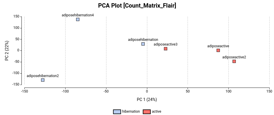 This feature performs a Principal Component Analysis and generates a 2D (Figure 12) or 3D (Figure 13) with the two and three first Principal Components, respectively. This chart helps to identify which samples are similar to each other in terms of gene expression. Ideally, samples belonging to the same condition should appear closer in the plot.