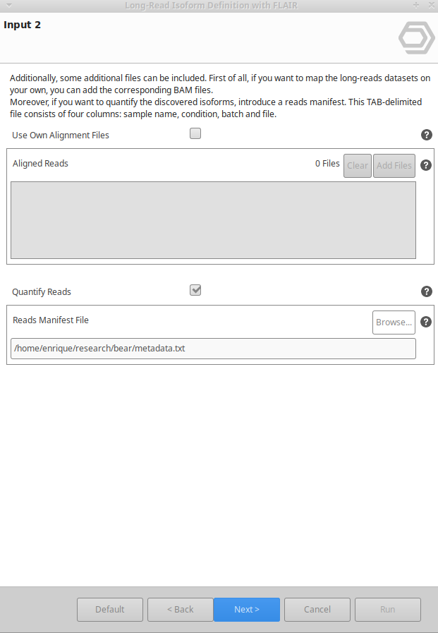 Aligned Reads: BAM files proceeding from aligning the input long-read FASTA/Q files. This option can be enabled if you want to map your long reads with other tool rather than Minimap2 (aligner used by FLAIR) or if you want to use a specific set of parameters.
