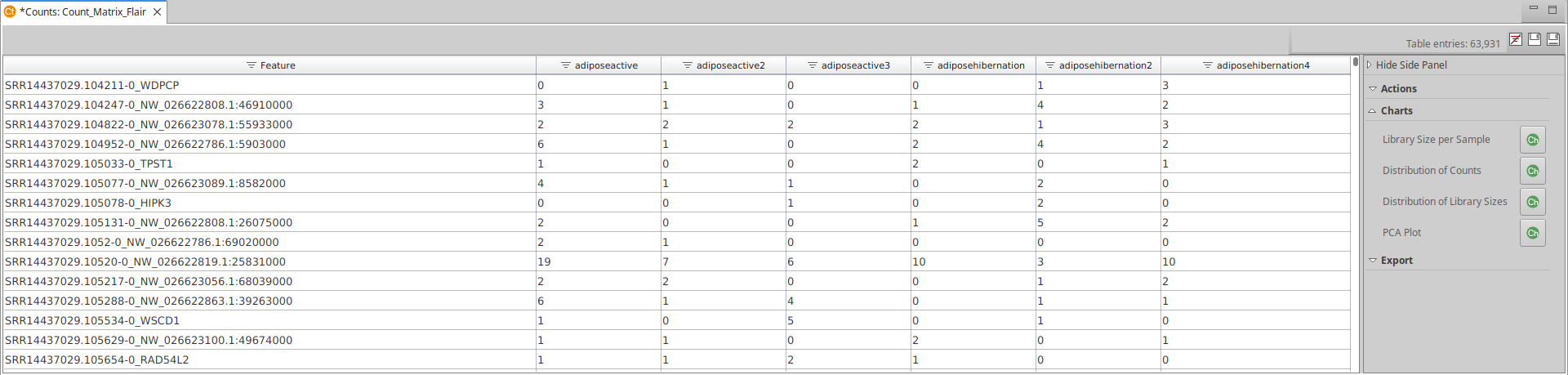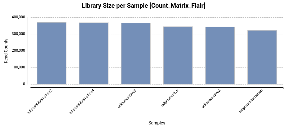 Different statistical charts can be generated from the count table. These charts provide additional information about the quantification, as well as a quality assessment of the resulting counts. These charts can be found under the Side Panel → Charts of the Count Table Viewer.