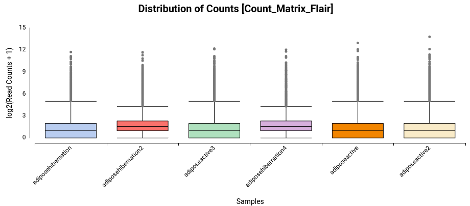 Box plot that allows seeing how counts are distributed within each sample for all the transcripts (Figure 10). Features with 0 counts in all samples will be discarded for this chart. The binary logarithm of raw counts is represented.