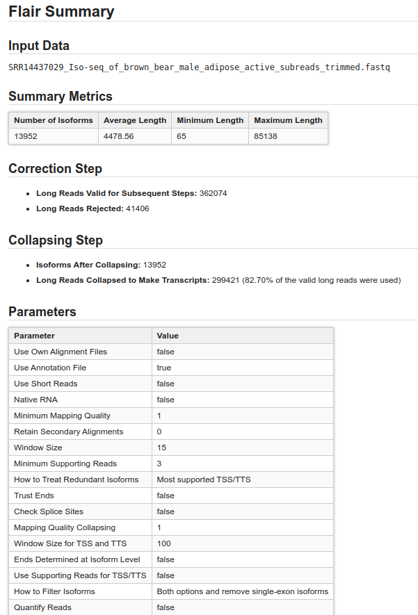This report first shows the input data used and then some summary metrics of the defined isoforms (number of isoforms and maximum, minimum and average length). After this summary, it shows the number of valid and dismissed transcripts during the correction step, and then, the number of isoforms created and of transcripts used for it. Finally, the chosen parameters are displayed.