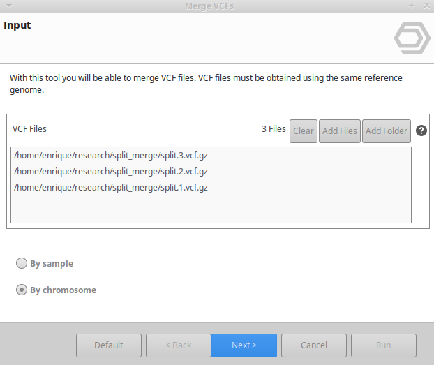 - By chromosome: select this option if you want to create a single VCF file from multiple VCF files with different chromosomes.