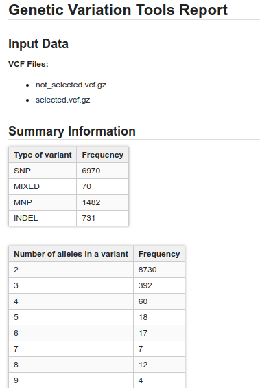 Appart from a VCF file that is the result of the merge of all the input VCF files, a Summary Report will appear. This report will have the following information: