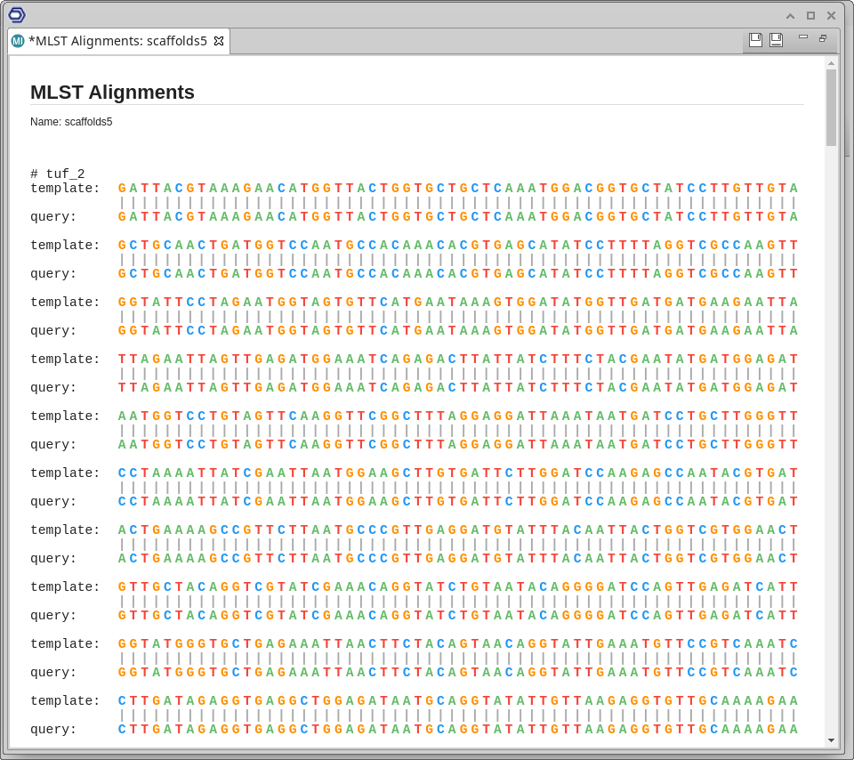 An MLST Alignments report will be generated with sample or file name and all the different housekeeping genes sequences found from the query reads aligned against the housekeeping genes template sequences (Figure 6). To access this report, right-click on the row of the sample, and select the "Show MLST Alignment Report".