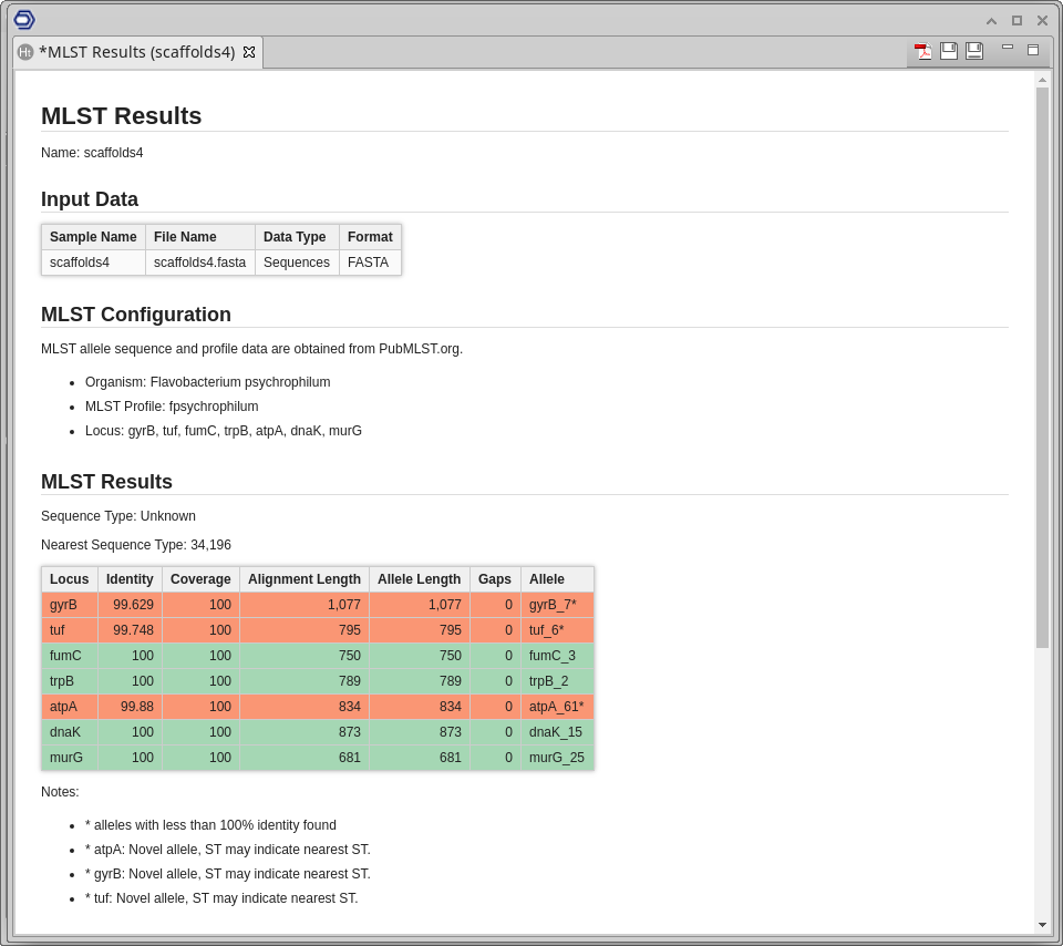 - Notes: It contains important information relevant to the sequence type result generated. "Matched" results will NOT any information in this column, however, "Partial" results will display all the alleles with discrepancies. This discrepancy may indicate that a novel allele was found, errors or SNPs. A detailed report containing the nucleotide(s) differences and location within the alleles can be found in the "MLST Alignment Report". "No Matched" results will indicate that no MLST loci were found in the input data, make sure that the correct MLST scheme was chosen.