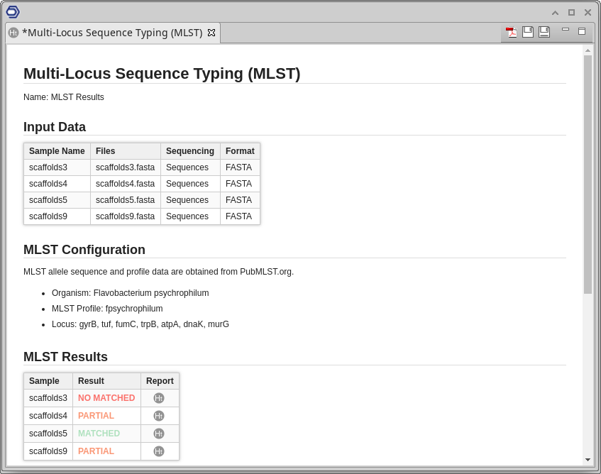 When the MLST completes, it also creates an MLST Report. This contains the information relevant to the MLST run, including the input data, MLST configuration used, MLST results, and the parameters used for the analysis (Figure 4).