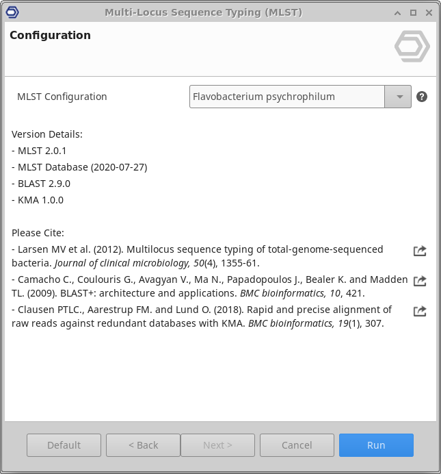 - MLST Configuration:Select the species database that will be used as a template for MLST prediction. If a wrong species is selected, the run may fail or the output will show no (zero) or minimal identity and coverage. MLST allele sequence and profile data are obtained from PubMLST.org.