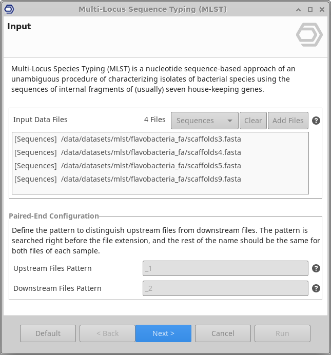 This functionality can be found under Genome Analysis → Multi-locus Sequence Typing (MLST). The wizard allows to select files and set the parameters (Figure 1 and Figure 2).