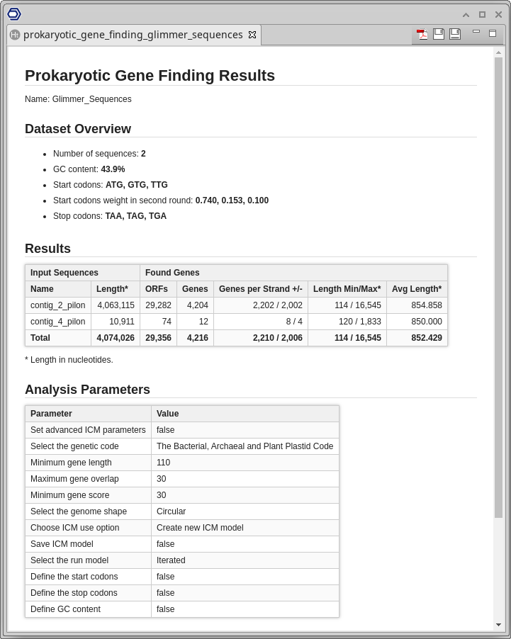 Once the prokaryotic gene-finding tool has finished, two projects are automatically opened: