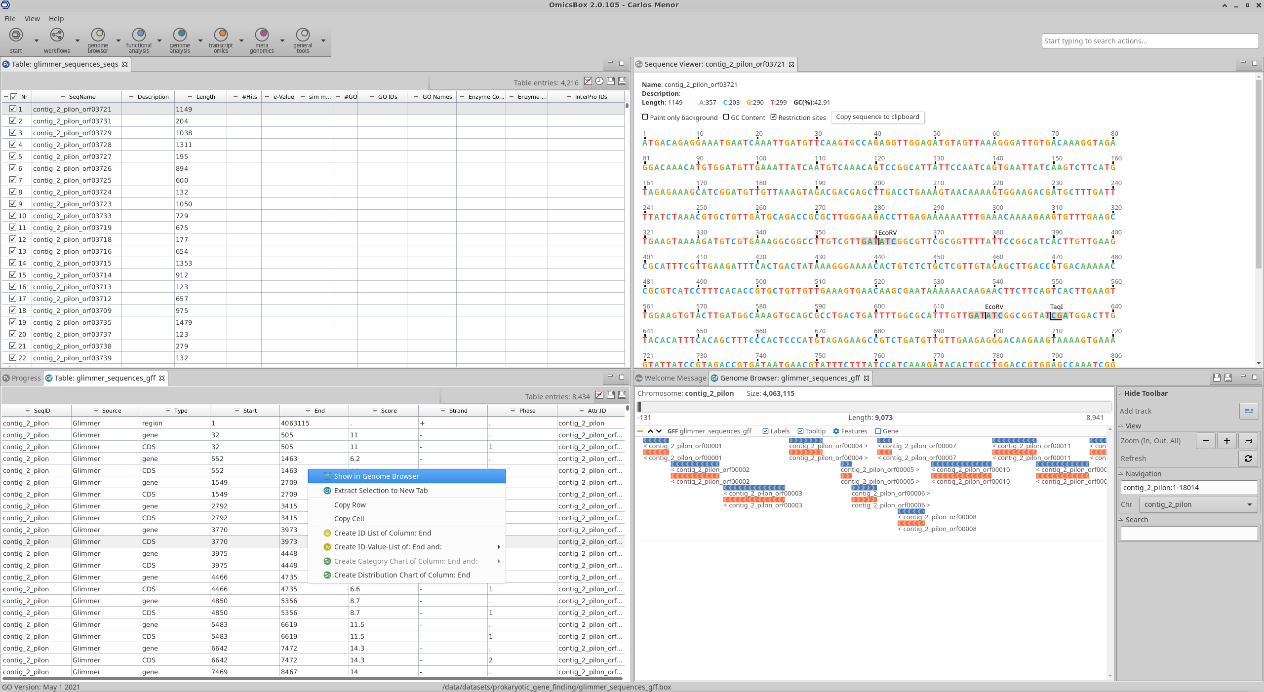 The resulting GFF3 can be inspected using the Genome Browser. To display a GFF entry right-click on it and select the Show in the Genome Browseroption (Figure 5). For more information about this feature visit the Genome Browser documentation section.