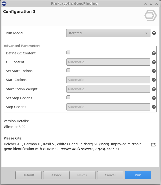 - Run Model: The single-mode executes Glimmer once. The iterated mode executes Glimmer twice, calculating automatically many parameters and using the results from the first run to generate a training set for the second one. This approach could increase the accuracy.