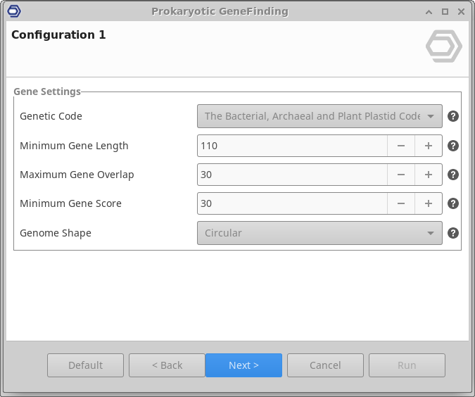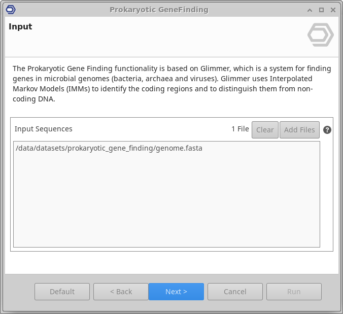 This functionality can be found under Genome Analysis → Gene Finding → Prokaryotic Gene Finding. The wizard allows to provide input files and adjust analysis parameters (Figure 1, Figure 2, Figure 3, and Figure 4).