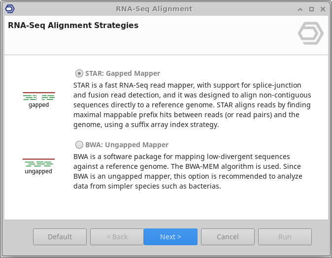 Read alignment is a common process applied to high-throughput sequencing data, being one of the first stages required for many different types of analysis. In the RNA-Seq scenario, this process is used to quantify gene expression. The goal of the read alignment is to map short sequencing reads efficiently to a large reference genome to identify the 'correct' genomic loci from which the read originated whilst taking into account errors in the sequence reads. This functionality can be found under transcriptomics → RNA-Seq Alignments.