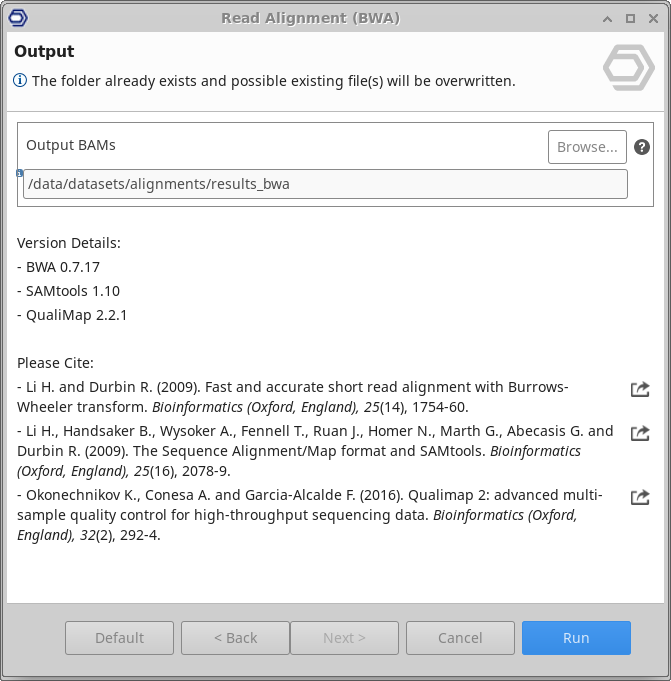 This functionality can be found under Transcriptomics → RNA-Seq Alignment → BWA. The wizard allows to select input files and adjust analysis parameters (Figure 1, Figure 2, Figure 3, and Figure 4).
