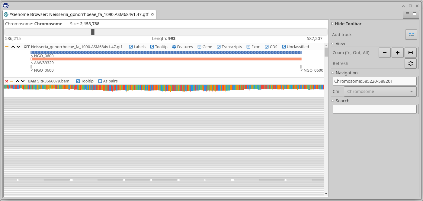 Finally, the Genome Browser allows you to visualize genomic coordinates (GFF/GTF) in a side-scrolling way. Several tracks can be added to the browser, the currently supported tracks are VCF, DNA Fasta, and BAM. The BAM track (Figure 7) shows the reads of a BAM file and if the sequence track is active, it will also highlight the differences between the read sequence and the sequence track.