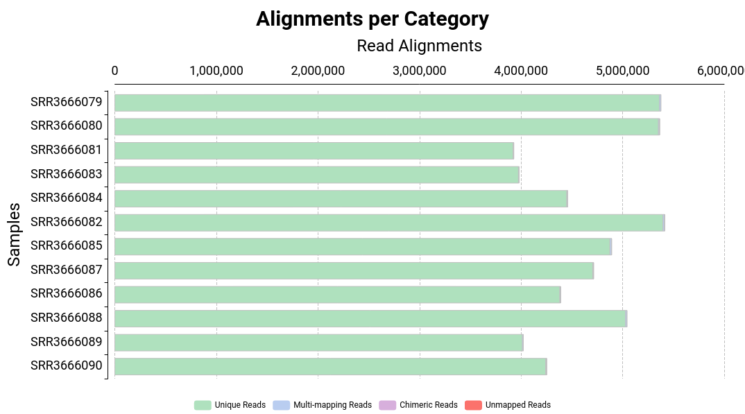 The bar chart (Figure 6) shows the number of reads of each input file sorted by different categories, according to how the read was aligned to the reference sequence: