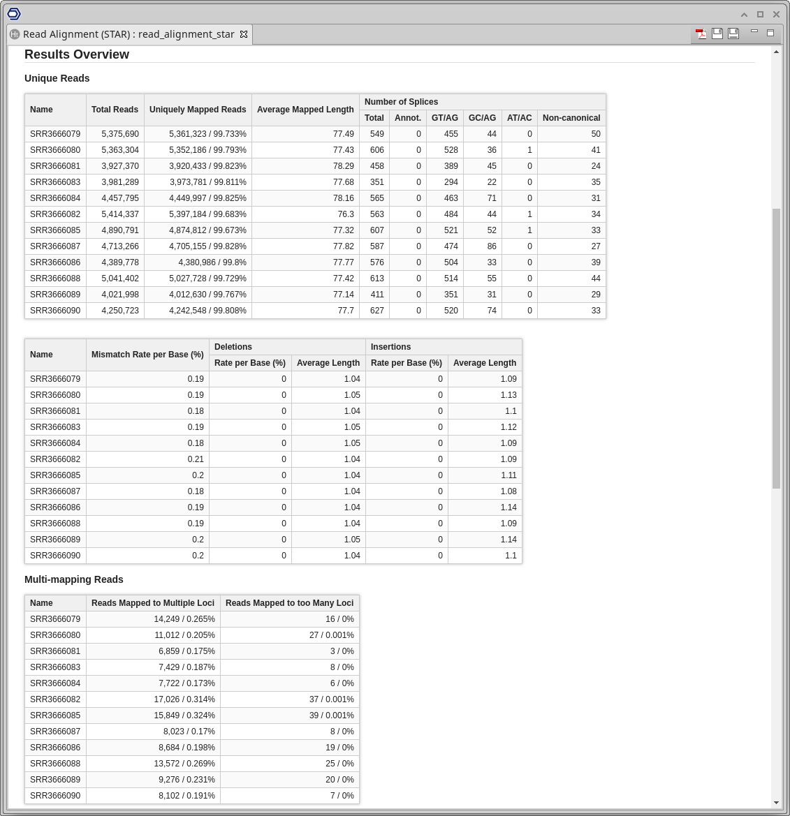 In addition, a report and a chart are generated with complementary information. The report shows a summary of the RNA-Seq Alignment results (Figure 5). This page contains information about the reference genome sequences, the input FASTQ files, and a results overview. The last section is divided into four subsections: unique reads, multi-mapping reads, chimeric reads, and unmapped reads.