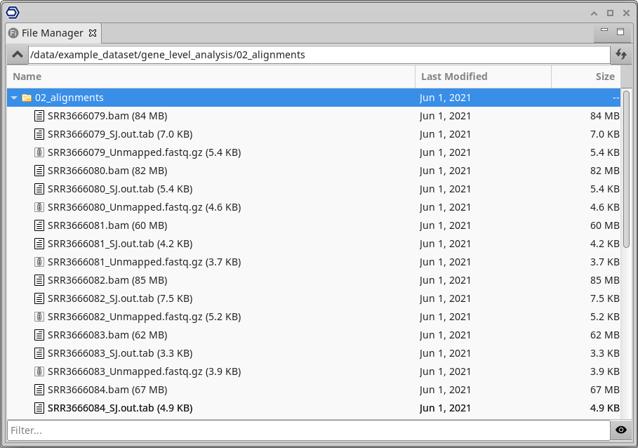 - Save Splice Junctions:Save high confidence collapsed splice junctions in tab-delimited format. Note that STAR defines the junction start/end as intronic bases. Files will be named as sample_name.Sj.out.tab, and will be placed in the "Alignment Files" destination folder.