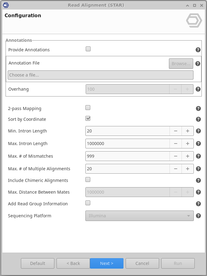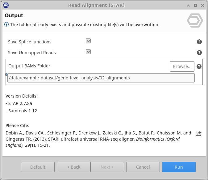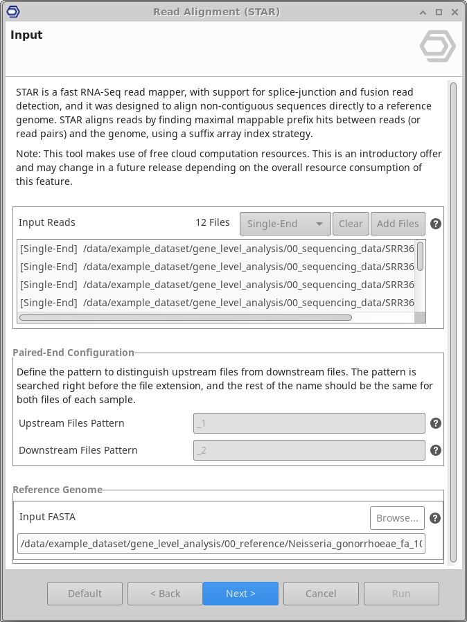 This functionality can be found under Transcriptomics → RNA-Seq Alignment → STAR.The wizard allows to select input files and adjust analysis parameters (Figure 1, Figure 2, and Figure 3).
