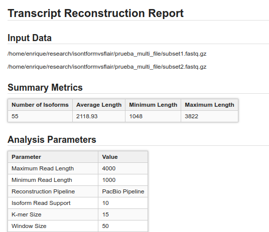 A summary report with the input FASTA filenames, information about the reconstructed transcriptome (number of isoforms and maximum, minimum and average length), the parameters set and the references will be generated too (see Figure 4). In addition, two charts will be output: