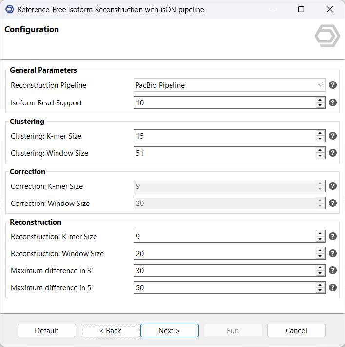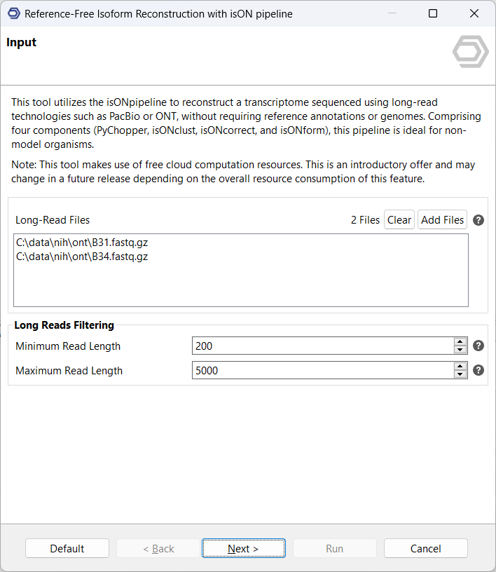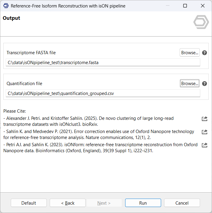 Reference-Free Isoform Reconstruction can be found in the Transcriptomics Module of OmicsBox under Transcriptomics → Long-Reads Analysis → Transcript Identification → Reference-free Isoform Reconstruction. The wizard consists of 3 pages and allows to define the input and output options as well as the analysis parameters (Figure 1, Figure 2, Figure 3).