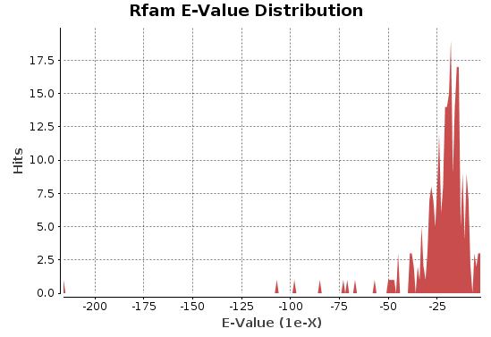 - E-Value Distribution: This chart plots the distribution of E-values for the Rfam hits.