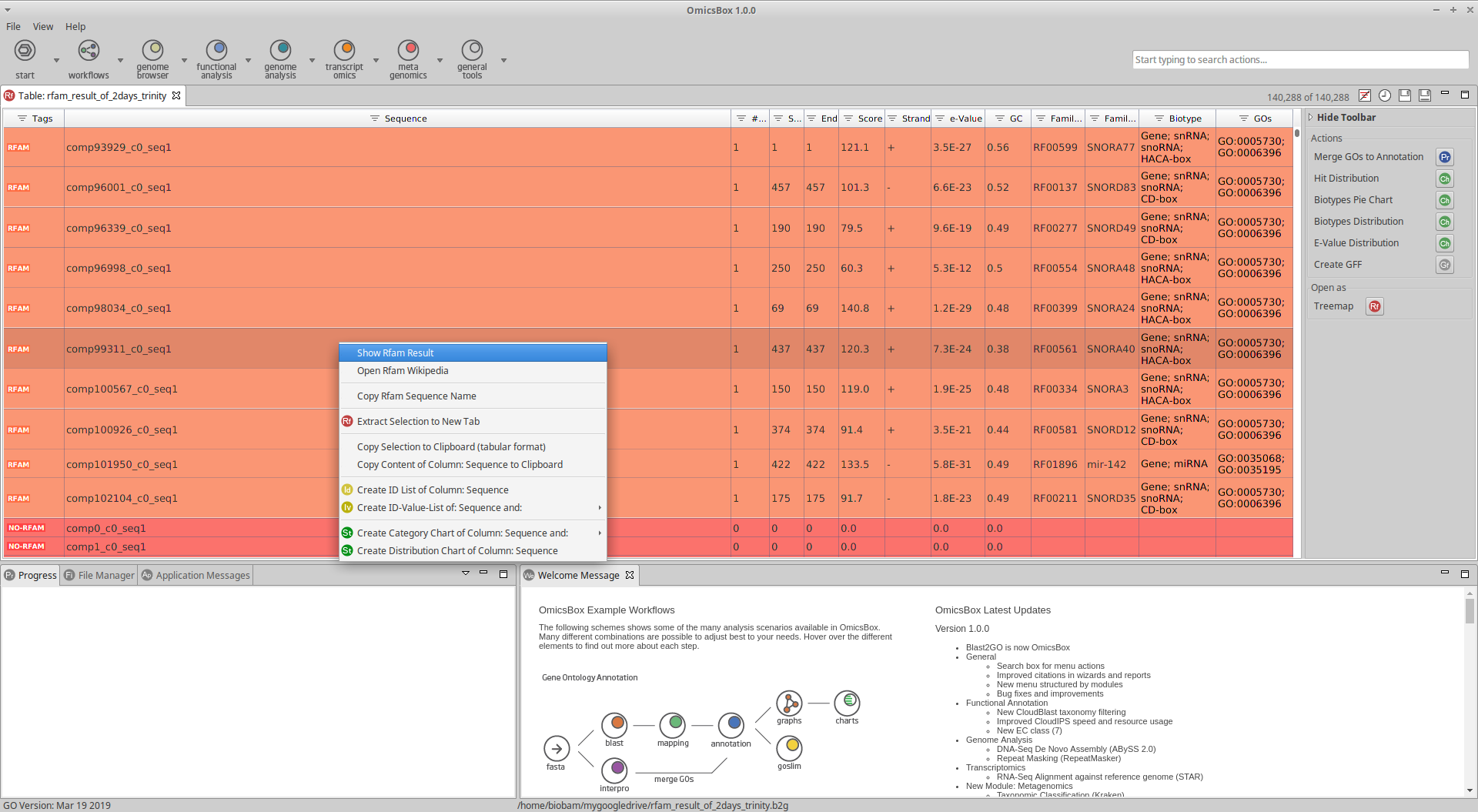 Once Rfam analysis has begun a table with the corresponding results will be displayed in a new tab. Sequences will turn red/orange depending if Rfam found hits for them (red if no hits were found, orange otherwise). White rows are sequences that have not been analysed yet. For each sequence It is possible to consult details about each one of their hits using the context menu (similar to consult Blast results).
