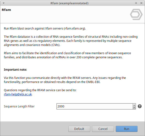 This functionality can be found under Functional Analysis → Coding Potential → Run Rfam. A dialog screen appears (see image below). Sequences longer than a given length can be skipped during the analysis.