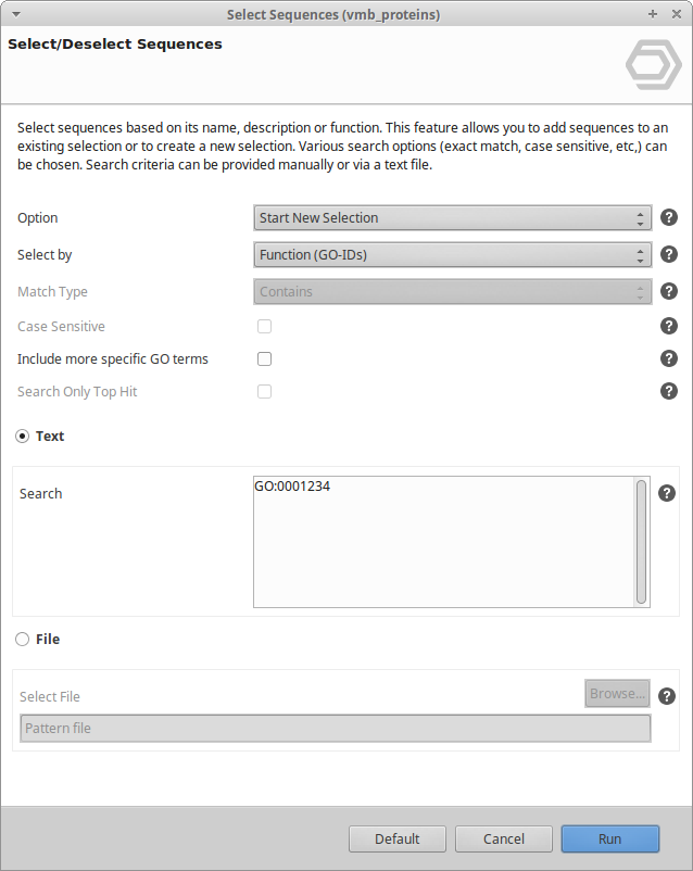 - Function (GO-Terms or GO-IDs). This is a general function for (de)selecting sequences by loading a file containing a list of GO-Terms or GO-IDs.