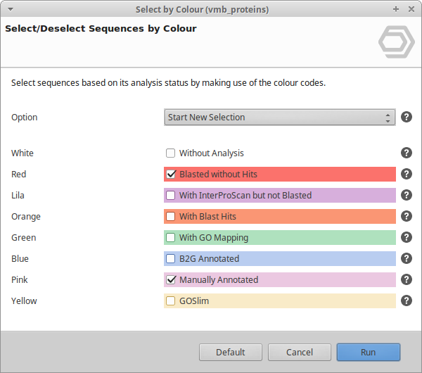 This function allows (de)selection of sequences on the basis of their color code i.e. the processing stage they have.